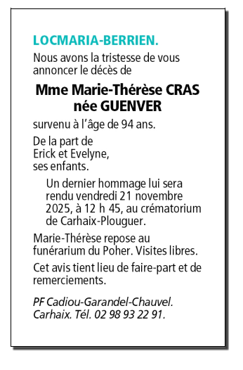 Cet espace « condoléances » est dédié à la mémoire de Madame Marie-Thérèse CRAS née GUENVER.