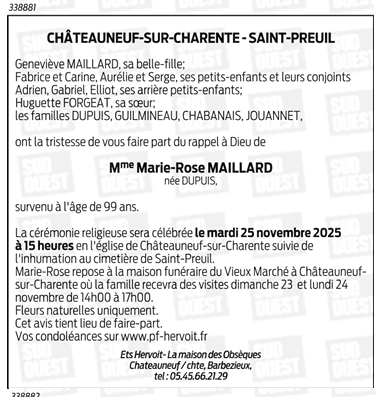 Cet espace « condoléances » est dédié à la mémoire de Madame Marie-Rose MAILLARD née DUPUIS.