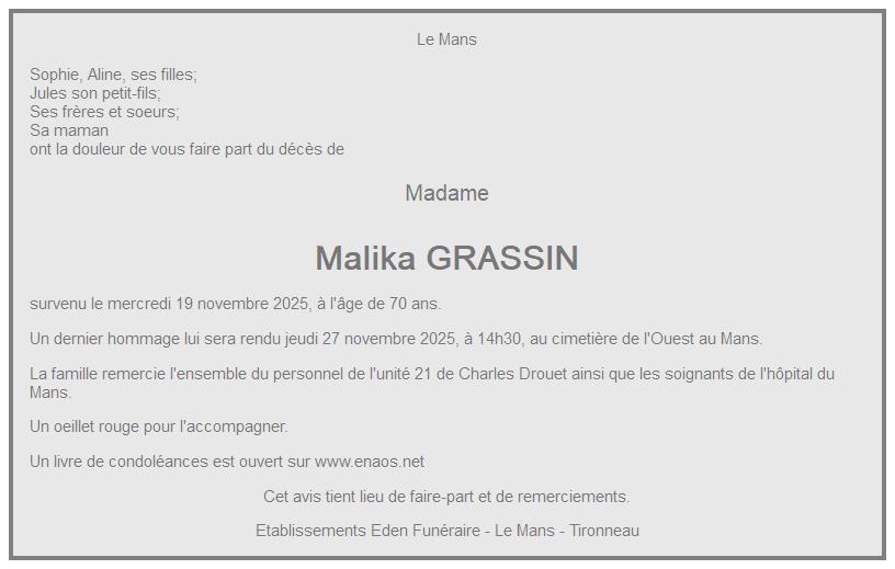 Cet espace « condoléances » est dédié à la mémoire de Madame Malika GRASSIN.