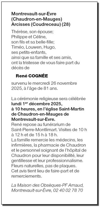Décédé à Chaudron en Mauges (49110) le mercredi 26 novembre 2025