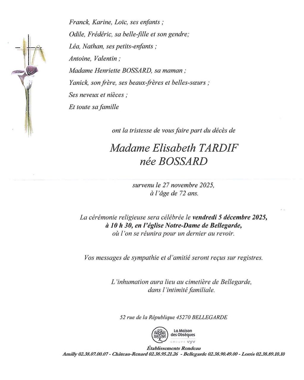 Cet espace « condoléances » est dédié à la mémoire de Madame Elisabeth TARDIF née BOSSARD.
