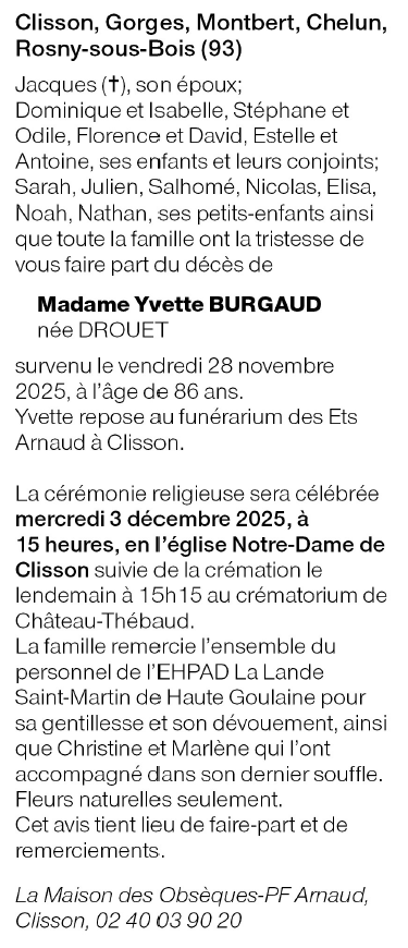 Cet espace « condoléances » est dédié à la mémoire de Madame Yvette BURGAUD née DROUET.
