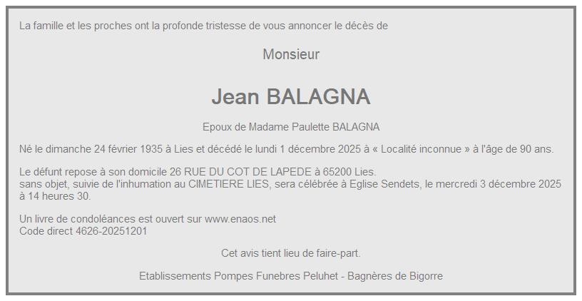 Cet espace « condoléances » est dédié à la mémoire de Monsieur Jean BALAGNA.