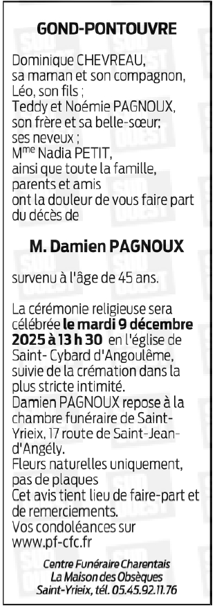 Cet espace « condoléances » est dédié à la mémoire de Monsieur Damien PAGNOUX.