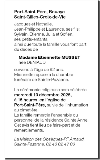 Décédée à Saint-Mars-de-Coutais (44680) le dimanche 7 décembre 2025