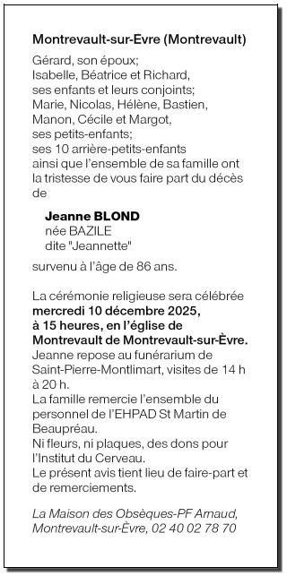 Cet espace « condoléances » est dédié à la mémoire de Madame Jeanne BLOND née BAZILE.