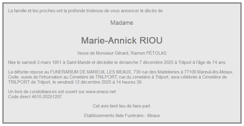 de Madame Marie-Annick PÉTOLAS née RIOU