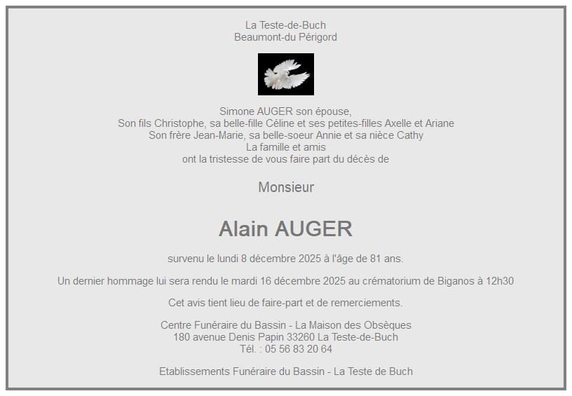 Cet espace « condoléances » est dédié à la mémoire de Monsieur Alain AUGER.