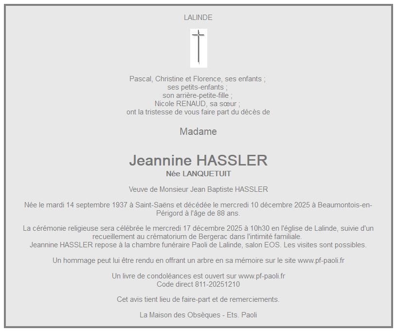 de Madame Jeannine HASSLER née LANQUETUIT