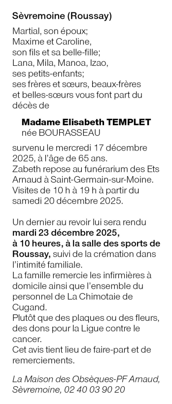Cet espace « condoléances » est dédié à la mémoire de Madame Elisabeth TEMPLET née BOURASSEAU.