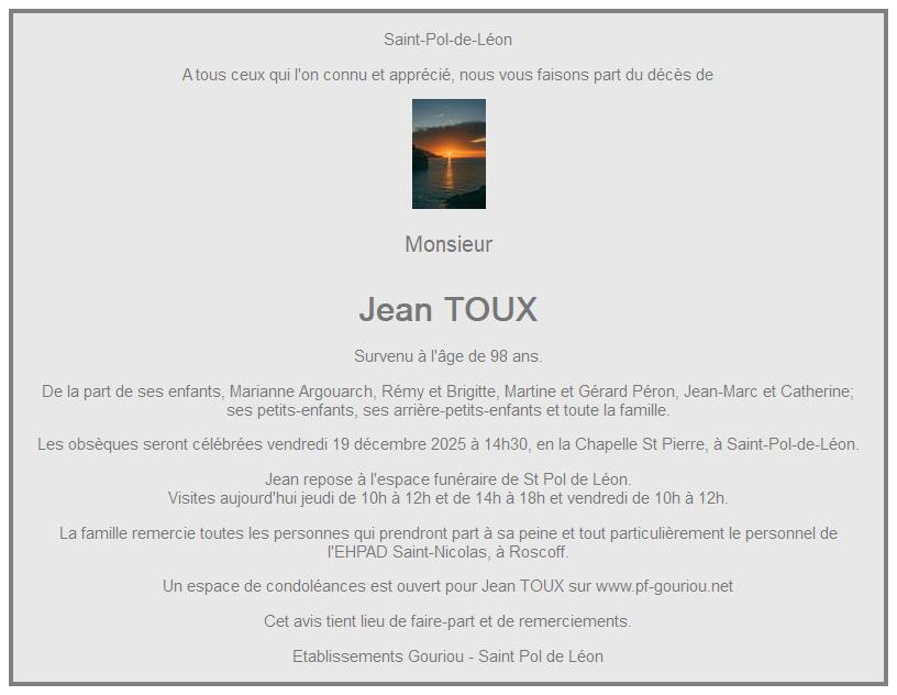 Cet espace « condoléances » est dédié à la mémoire de Monsieur Jean TOUX.