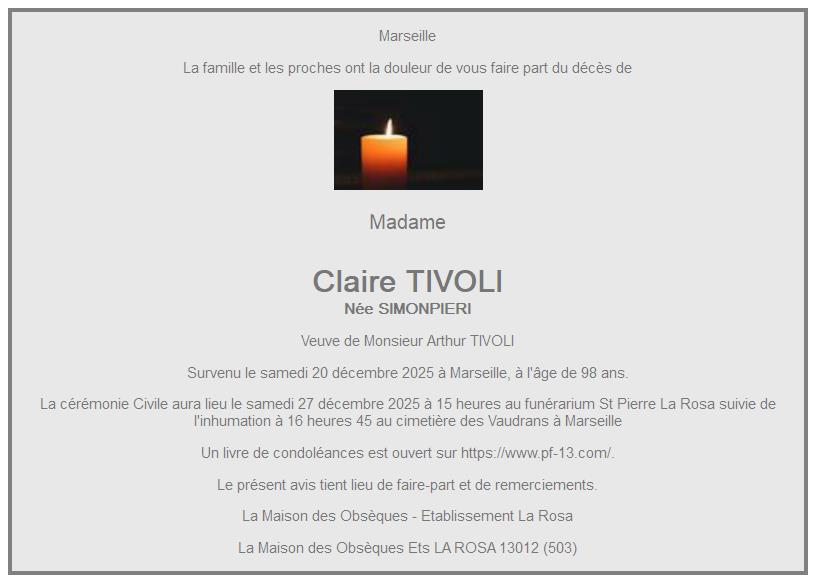 Cet espace « condoléances » est dédié à la mémoire de Madame Claire TIVOLI née SIMONPIERI.