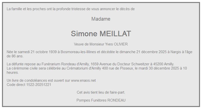 Cet espace « condoléances » est dédié à la mémoire de Madame Simone OLIVIER née MEILLAT.
