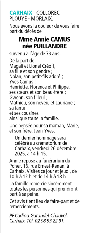 Décédée à Carhaix-Plouguer (29270) le mardi 23 décembre 2025