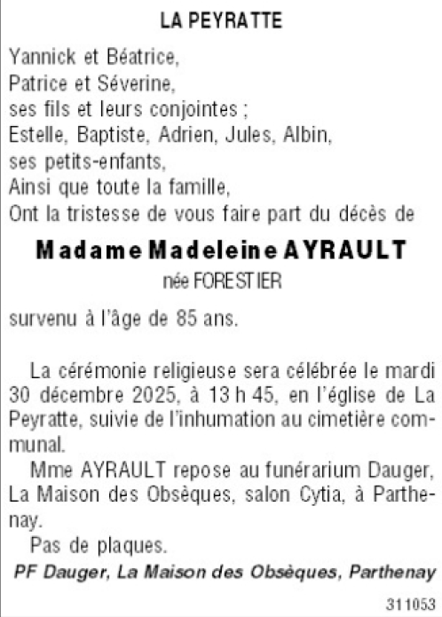 Cet espace « condoléances » est dédié à la mémoire de Madame Madeleine AYRAULT née FORESTIER.