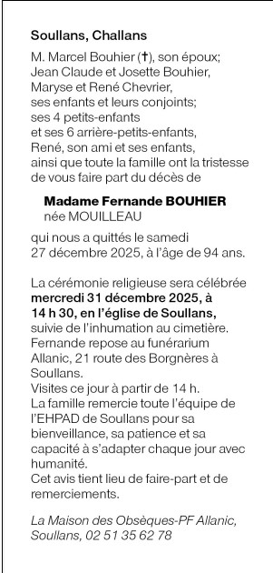 Cet espace « condoléances » est dédié à la mémoire de Madame Fernande BOUHIER née MOUILLEAU.