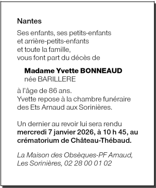 de Madame Yvette BONNEAUD née BARILLERE