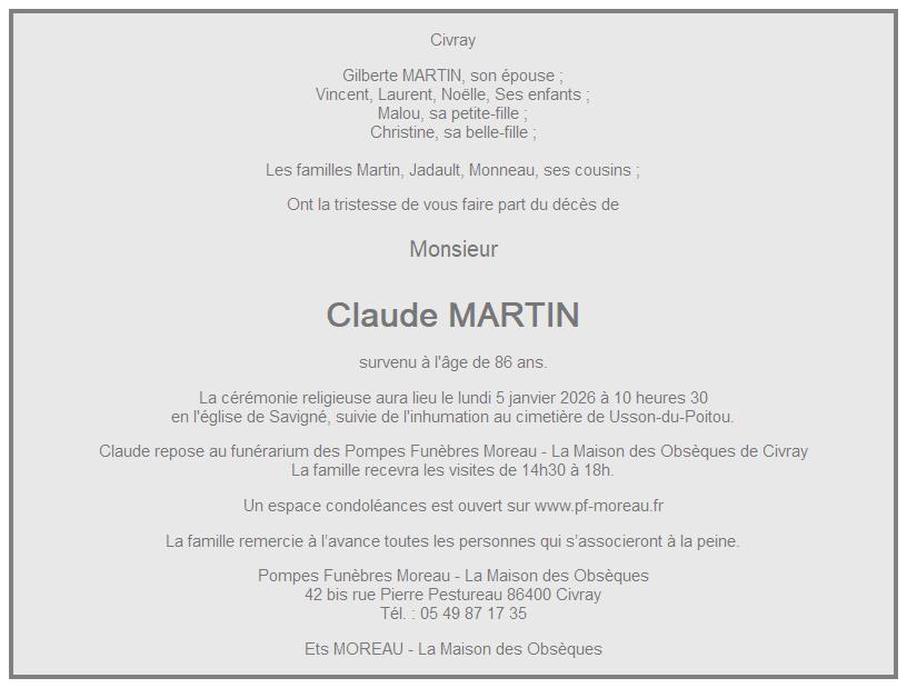Cet espace « condoléances » est dédié à la mémoire de Monsieur Claude MARTIN.