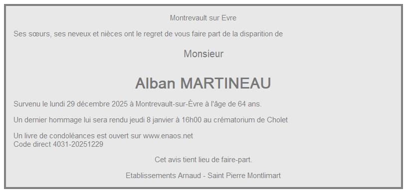 Cet espace « condoléances » est dédié à la mémoire de Monsieur Alban MARTINEAU.