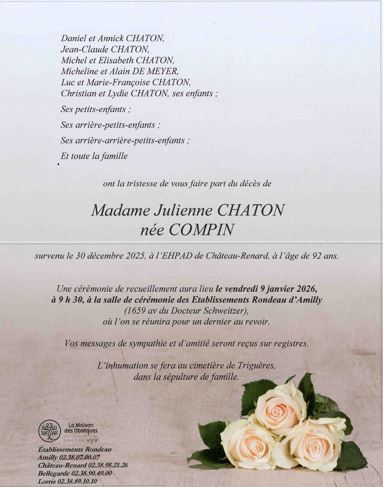 Cet espace « condoléances » est dédié à la mémoire de Madame Julienne CHATON née COMPIN.