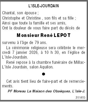 Cet espace « condoléances » est dédié à la mémoire de Monsieur René LEPOT.