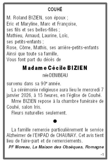 Cet espace « condoléances » est dédié à la mémoire de Madame Cécile BIZIEN née DENIBEAU.