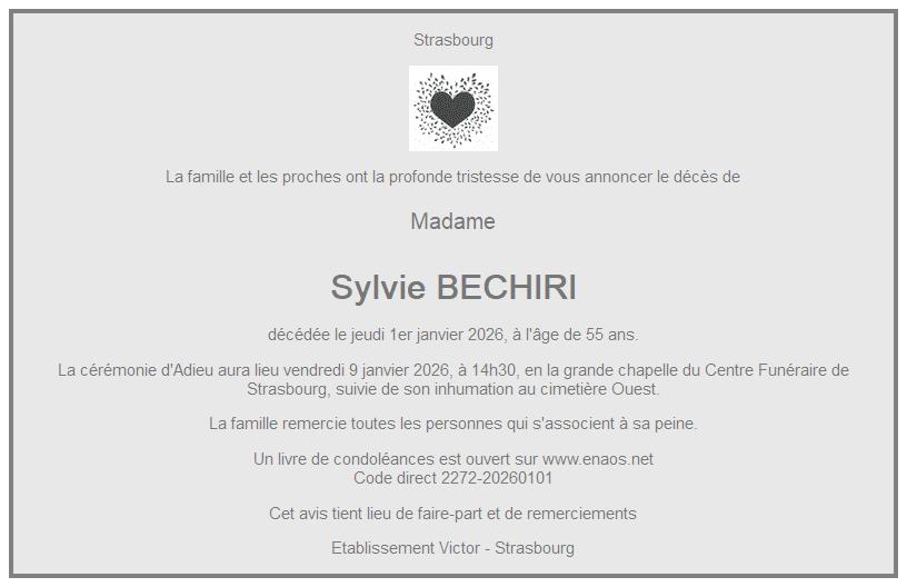 Cet espace « condoléances » est dédié à la mémoire de Madame Sylvie BECHIRI.