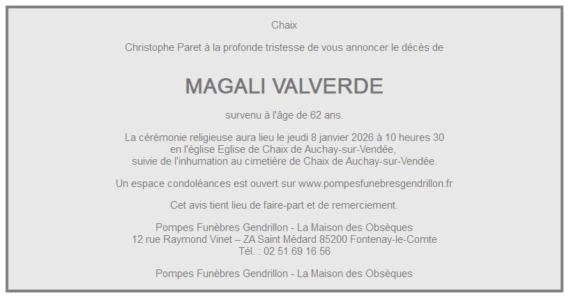 Cet espace « condoléances » est dédié à la mémoire de Madame MAGALI VALVERDE.