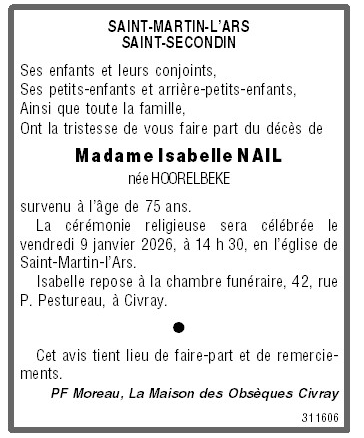 Cet espace « condoléances » est dédié à la mémoire de Madame Isabelle NAIL née HOORELBEKE.
