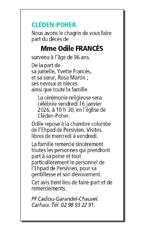 Cet espace « condoléances » est dédié à la mémoire de Madame Odile FRANCÈS.