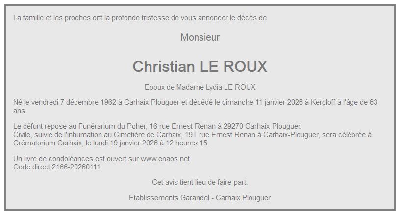 Cet espace « condoléances » est dédié à la mémoire de Monsieur Christian LE ROUX.