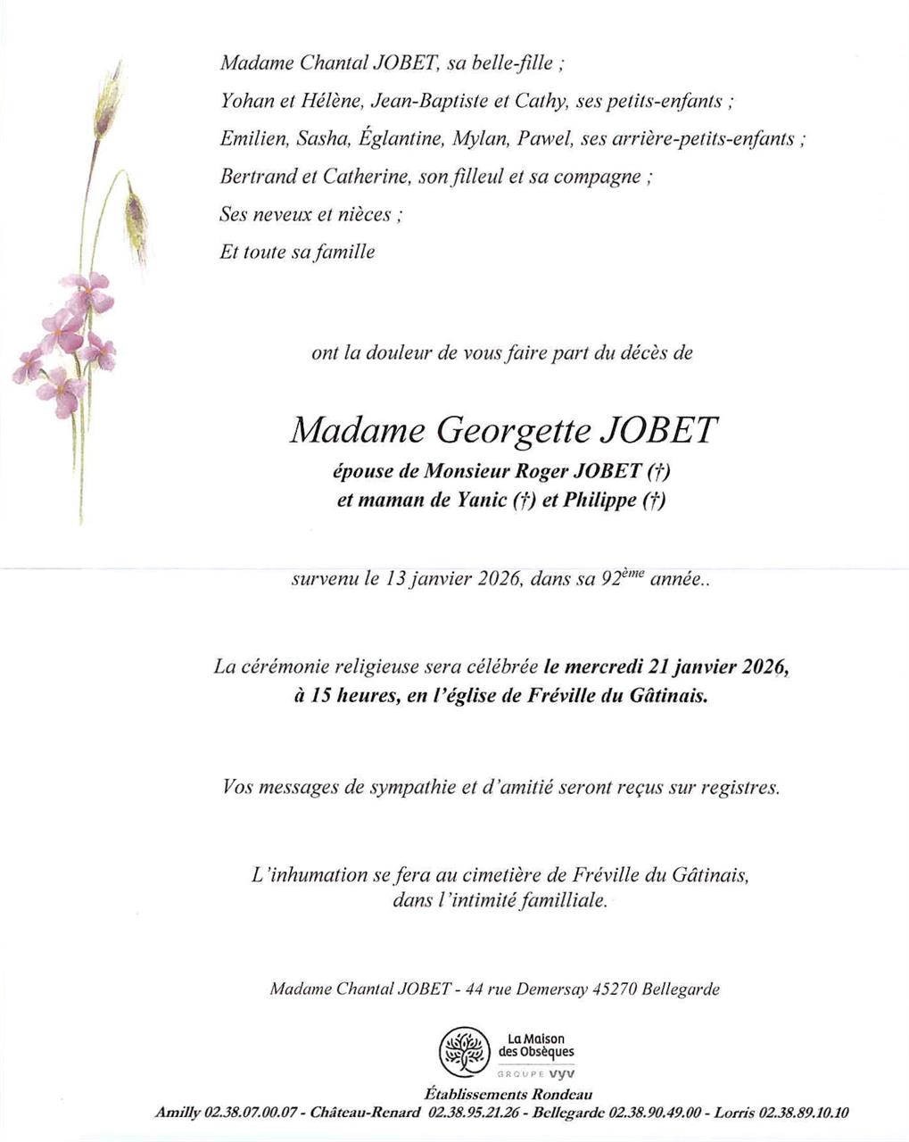 Cet espace « condoléances » est dédié à la mémoire de Madame Georgette JOBET.