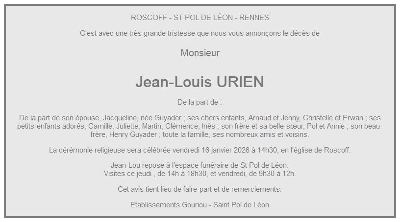Cet espace « condoléances » est dédié à la mémoire de Monsieur Jean-Louis URIEN.