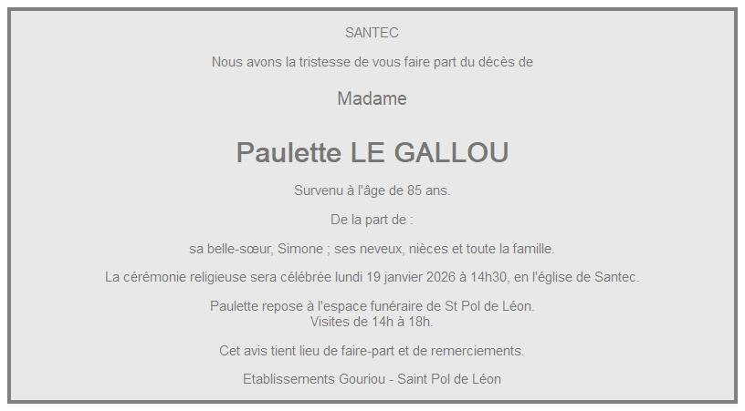 Cet espace « condoléances » est dédié à la mémoire de Madame Paulette LE GALLOU.