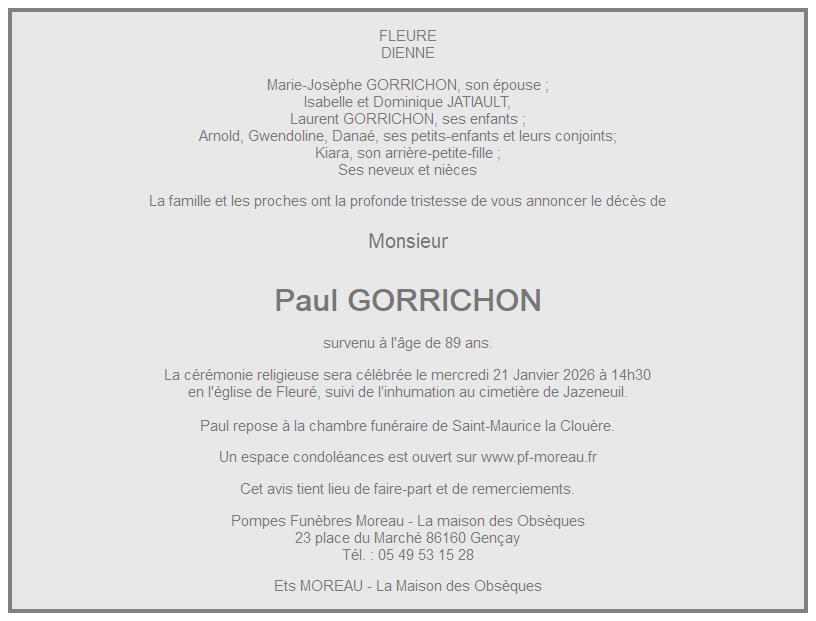 Cet espace « condoléances » est dédié à la mémoire de Monsieur Paul GORRICHON.