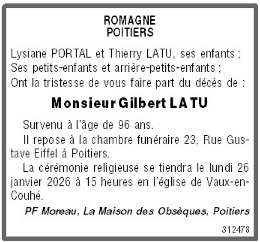 Décédé à Fontaine-le-Comte (86240) le vendredi 16 janvier 2026