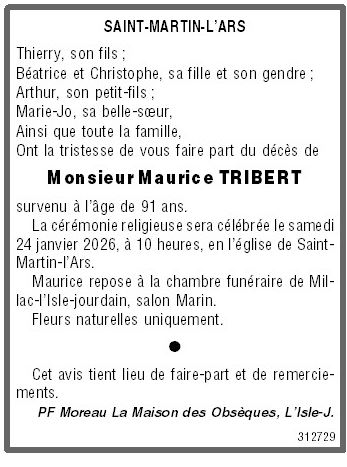 Cet espace « condoléances » est dédié à la mémoire de Monsieur Maurice TRIBERT.