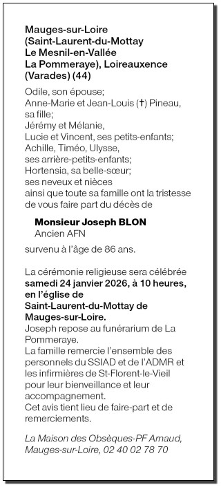 Décédé à Saint Laurent du Mottay (49410) le mardi 20 janvier 2026