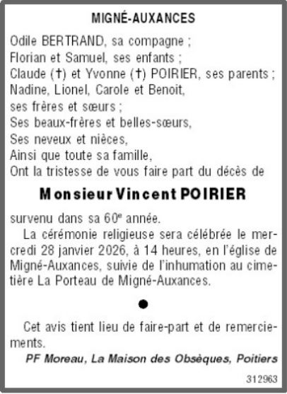 Décédé à Migné-Auxances (86440) le mardi 13 janvier 2026