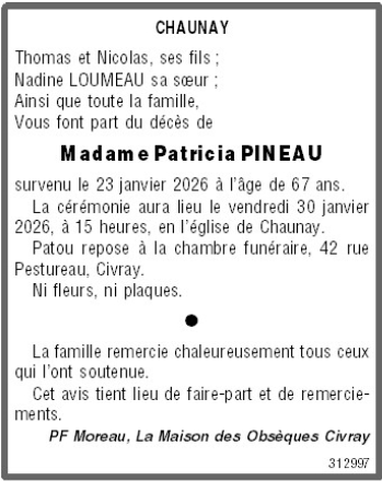 Cet espace « condoléances » est dédié à la mémoire de Madame Patricia PINEAU.