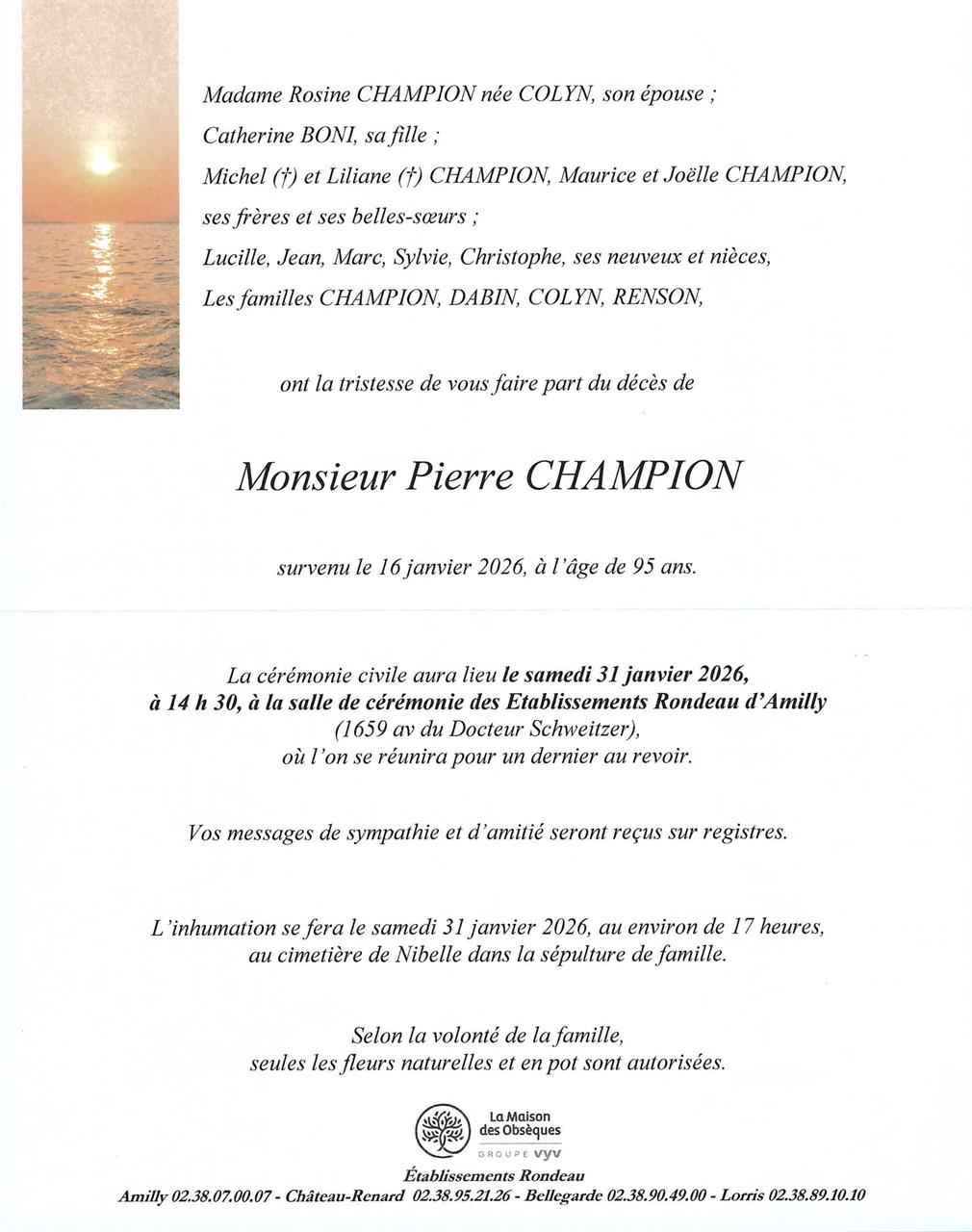 Cet espace « condoléances » est dédié à la mémoire de Monsieur Pierre CHAMPION.