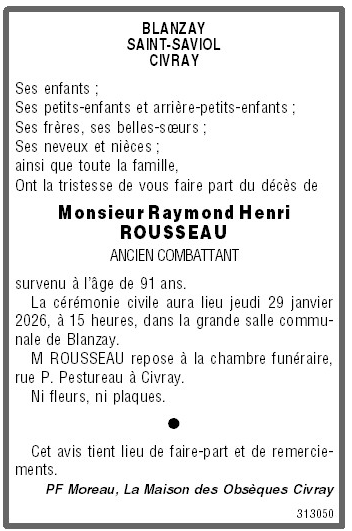 Cet espace « condoléances » est dédié à la mémoire de Monsieur Raymond ROUSSEAU.