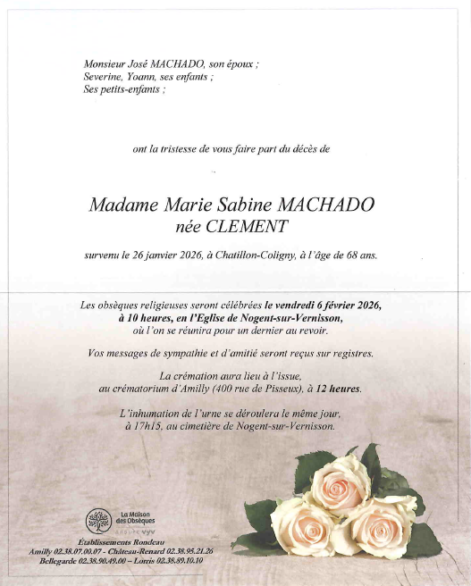 Cet espace « condoléances » est dédié à la mémoire de Madame Marie MACHADO née CLEMENT.