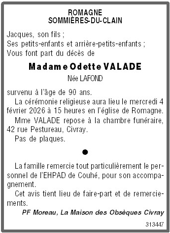 Cet espace « condoléances » est dédié à la mémoire de Madame Odette VALADE née LAFOND.