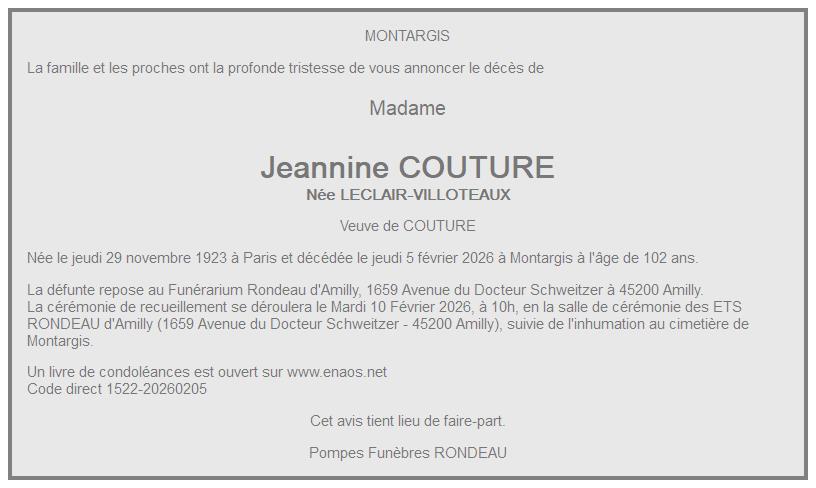 de Madame Jeannine COUTURE née LECLAIR-VILLOTEAUX