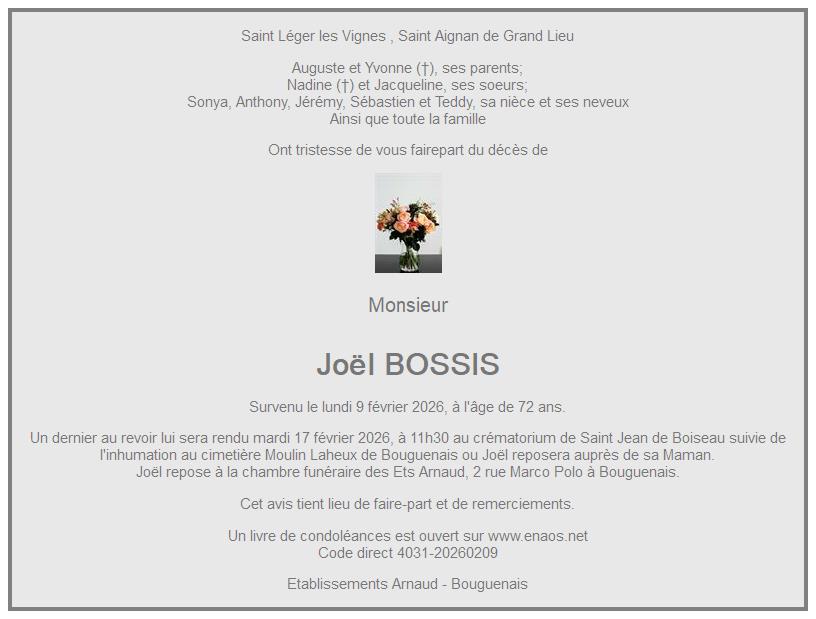 Cet espace « condoléances » est dédié à la mémoire de Monsieur Joël BOSSIS.