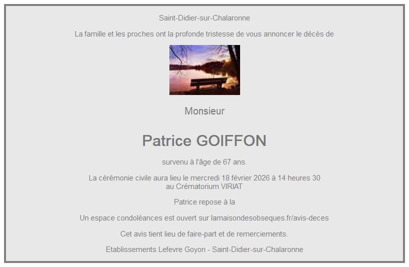 Cet espace « condoléances » est dédié à la mémoire de Monsieur Patrice GOIFFON.