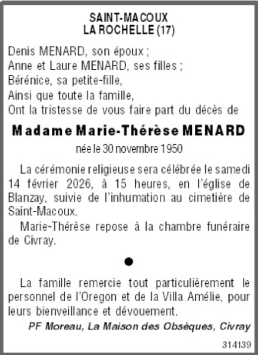 Cet espace « condoléances » est dédié à la mémoire de Madame Marie-Thérèze MÉNARD née MAÎTRE.