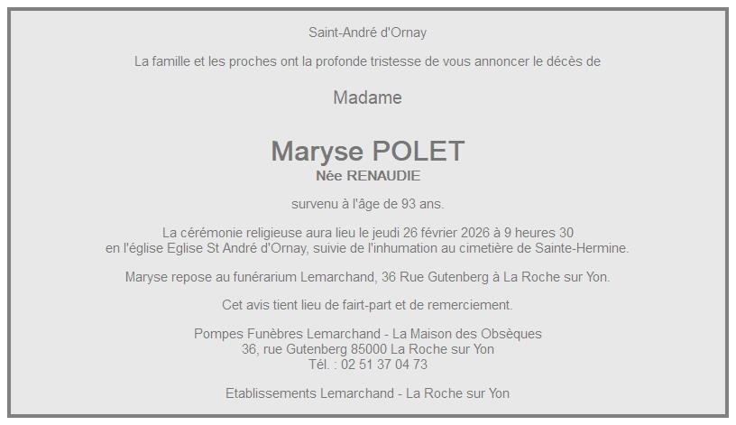 Cet espace « condoléances » est dédié à la mémoire de Madame Maryse POLET née RENAUDIE.