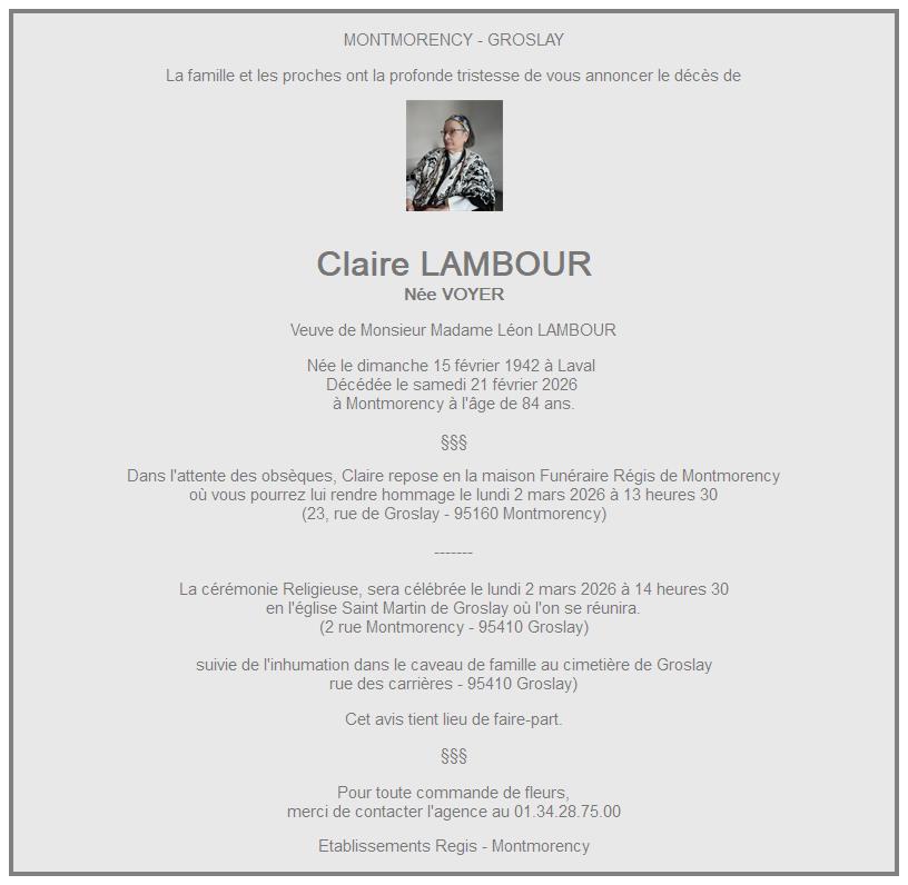 Cet espace « condoléances » est dédié à la mémoire de Madame Claire LAMBOUR née VOYER.